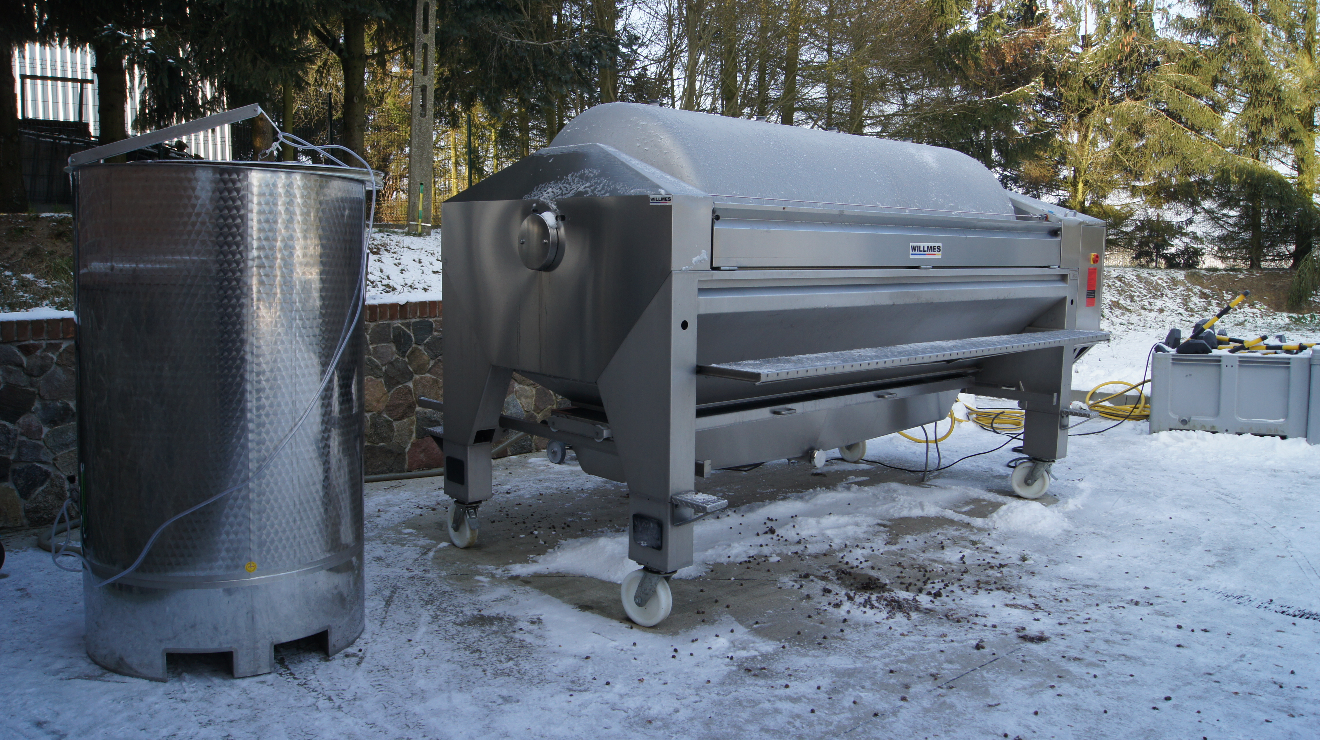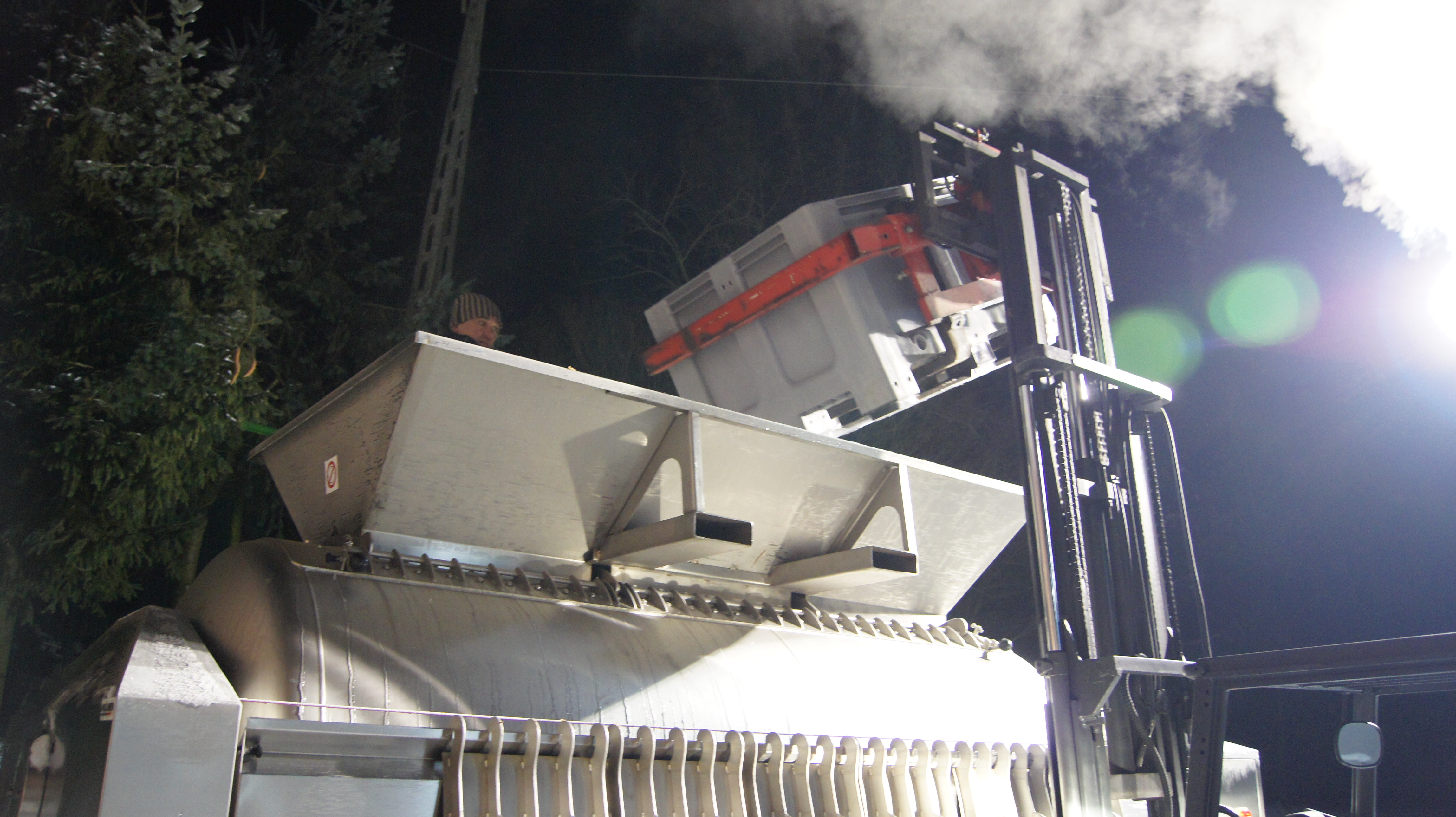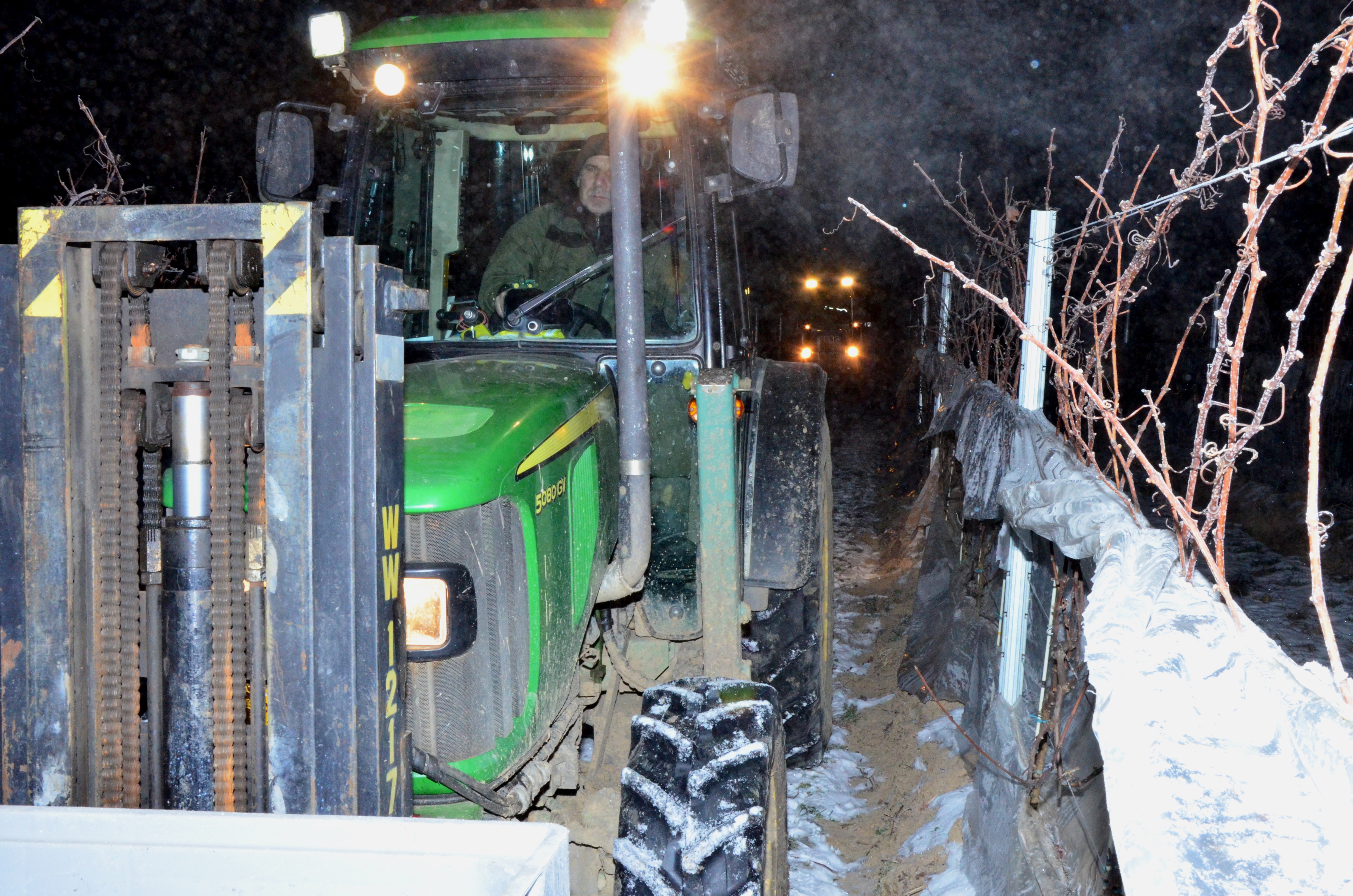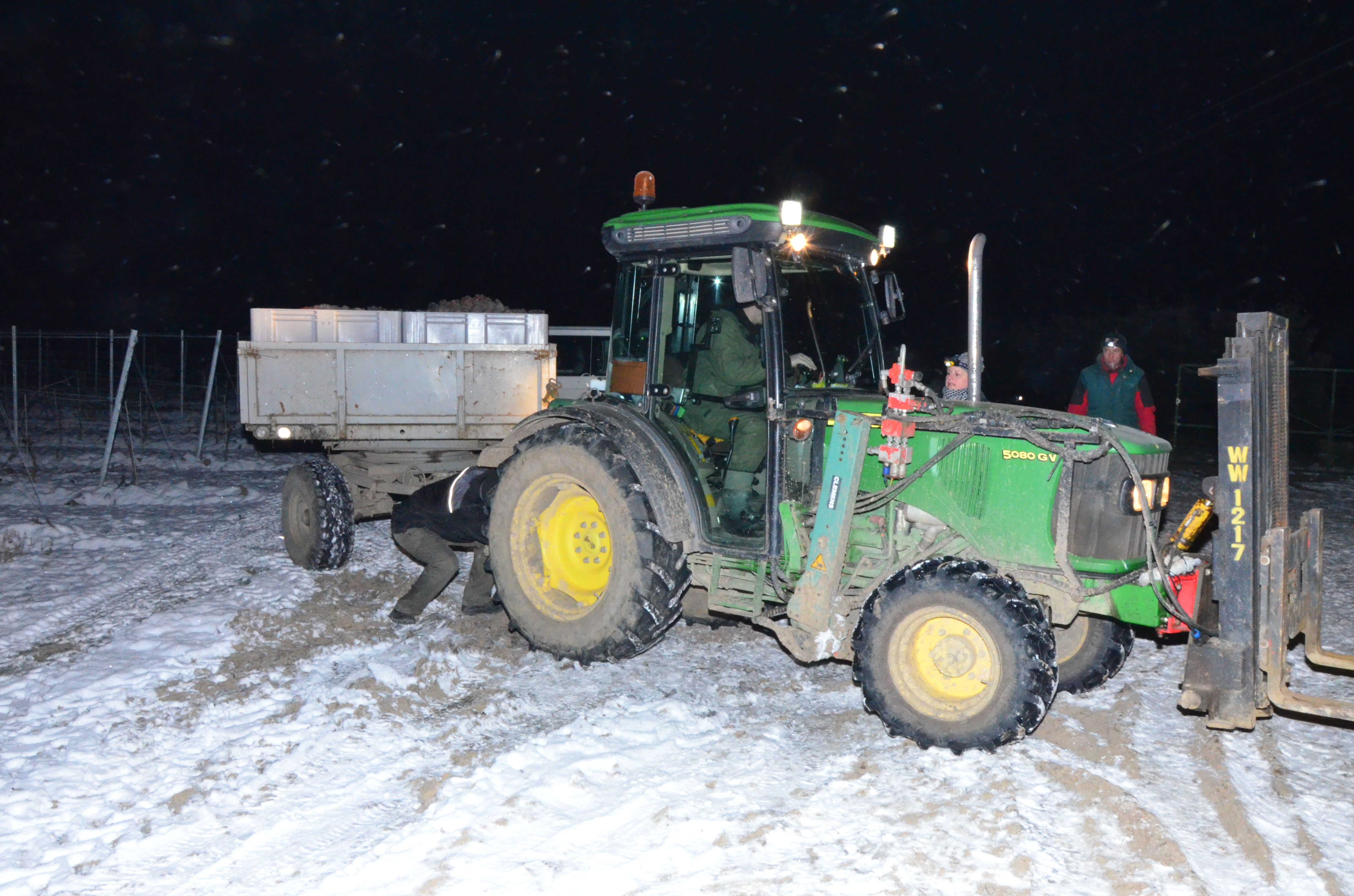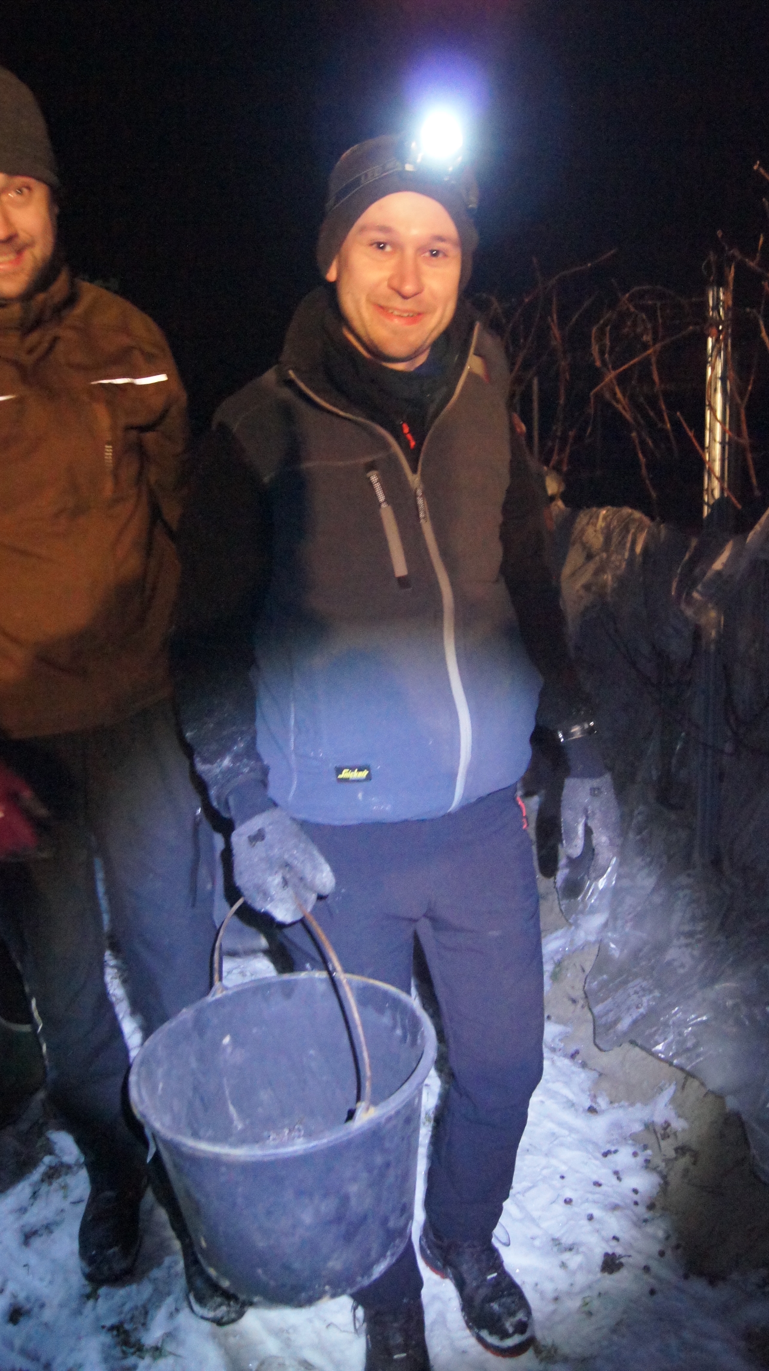 On the morning of February 7, our enologist, Frank Faust, decided that the grapes were frozen enough and at 4 in the morning harvest began.