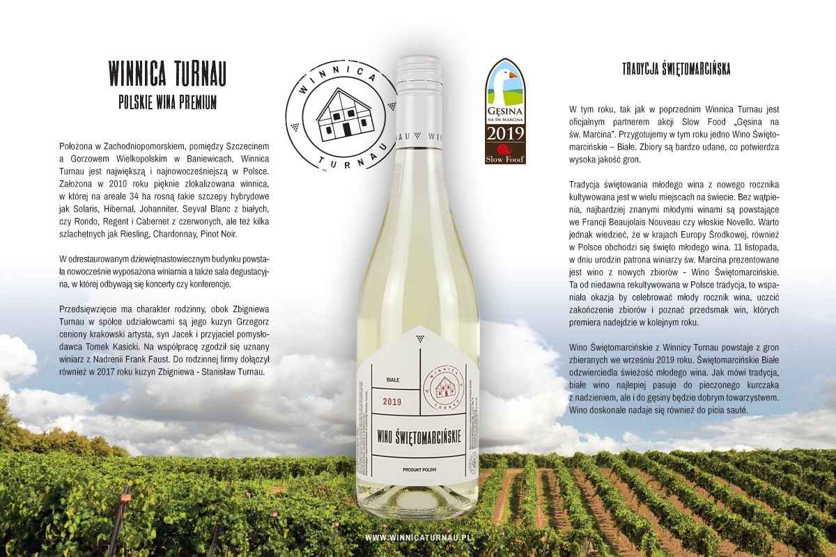 Winogrona na Wino Świętomarcińskie zostały zebrane już w połowie września. Pozwoliło to zachować chrupkość i lekkość wina, dzięki czemu idealnie odnajdzie się ono w towarzystwie gęsiego pasztetu, drobiu, sałat nasyconych oliwą lub jogurtem, będzie współgrać z owocami morza i morskimi rybami i na pewno z łatwością wcieli się w aperitif.