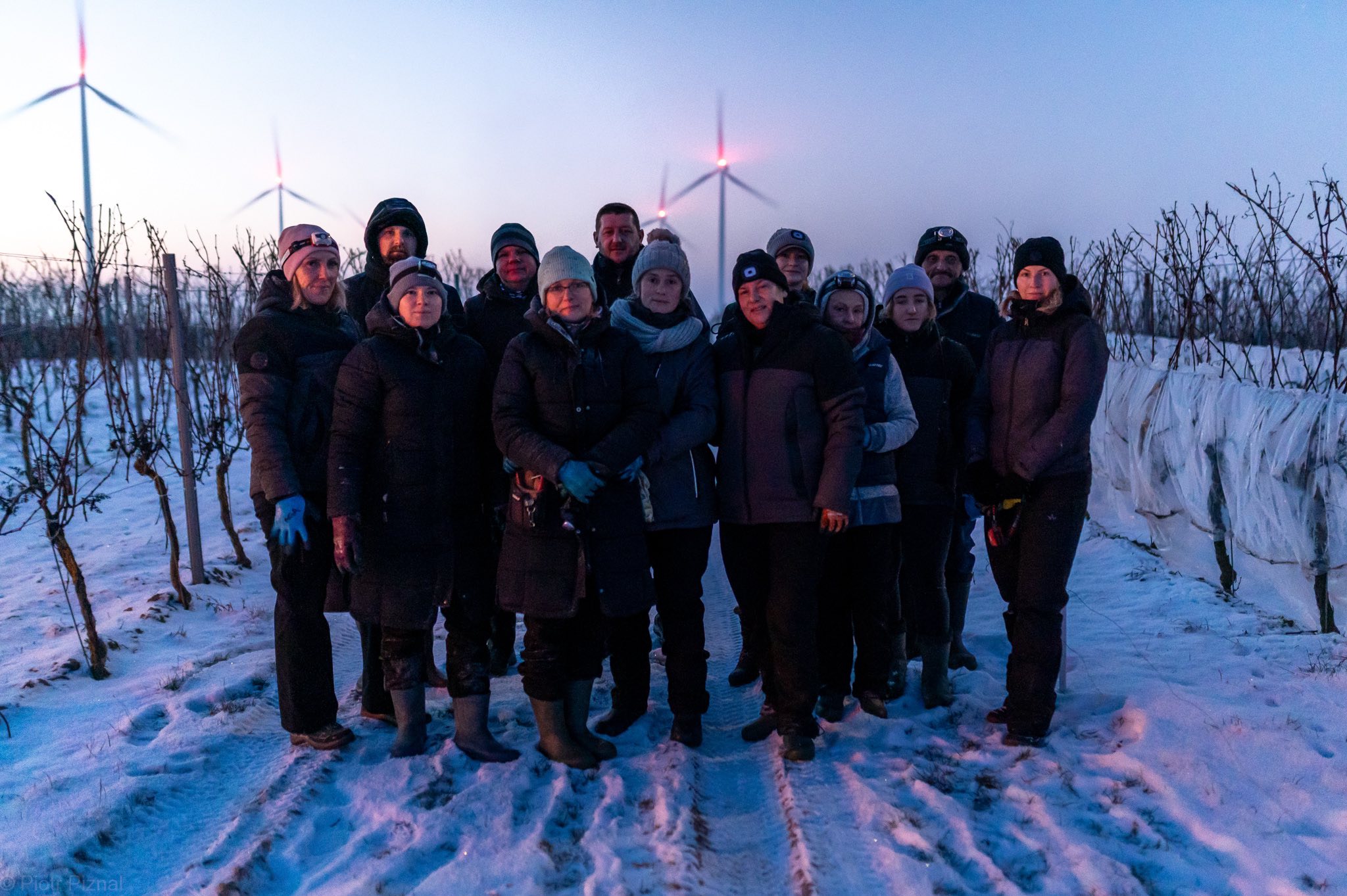 Wczoraj nad ranem udało nam się zebrać dokładnie 1162 kg zmrożonych gron odmiany cabernet cortis przeznaczonych na wino lodowe! Emocji było dużo, bo szykowaliśmy się do zbiorów już od świąt. Tym razem pogodowo wszystko zagrało perfekcyjnie i mogliśmy stawić się na miejscu o 4:00. Wyposażeni w latarki i mnóstwo porannej energii, zebraliśmy grona z półhektarowej parceli, która czekała właśnie na tę noc.
